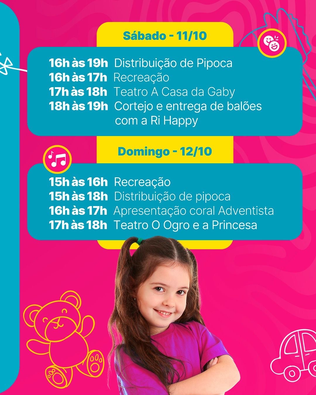 Evento acontece entre os dias 10 e 12 de outubro e reúne teatro, música, recreação e distribuição de pipoca