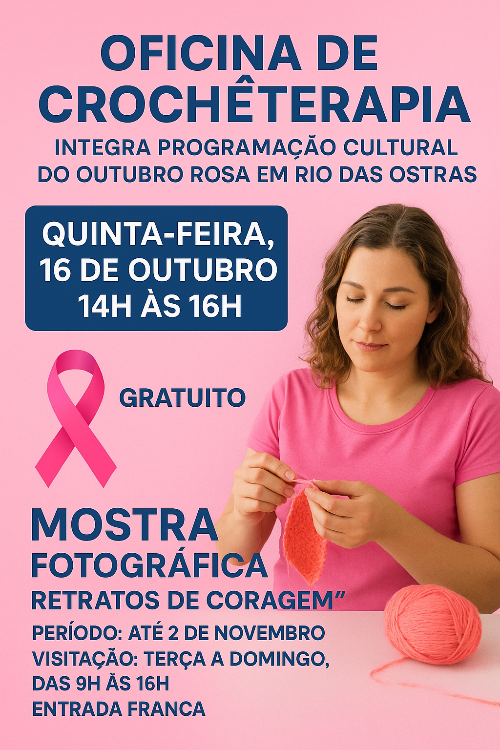 A campanha Outubro Rosa em Rio das Ostras ganha um toque especial de acolhimento e criatividade com a Oficina de Crochêterapia, que acontece nesta quinta-feira, dia 16 de outubro, das 14h às 16h, no Parque dos Pássaros. A atividade integra a programação cultural promovida pela Fundação Rio das Ostras de Cultura (Froc) e busca unir arte, bem-estar e conscientização sobre a importância da prevenção ao câncer de mama.