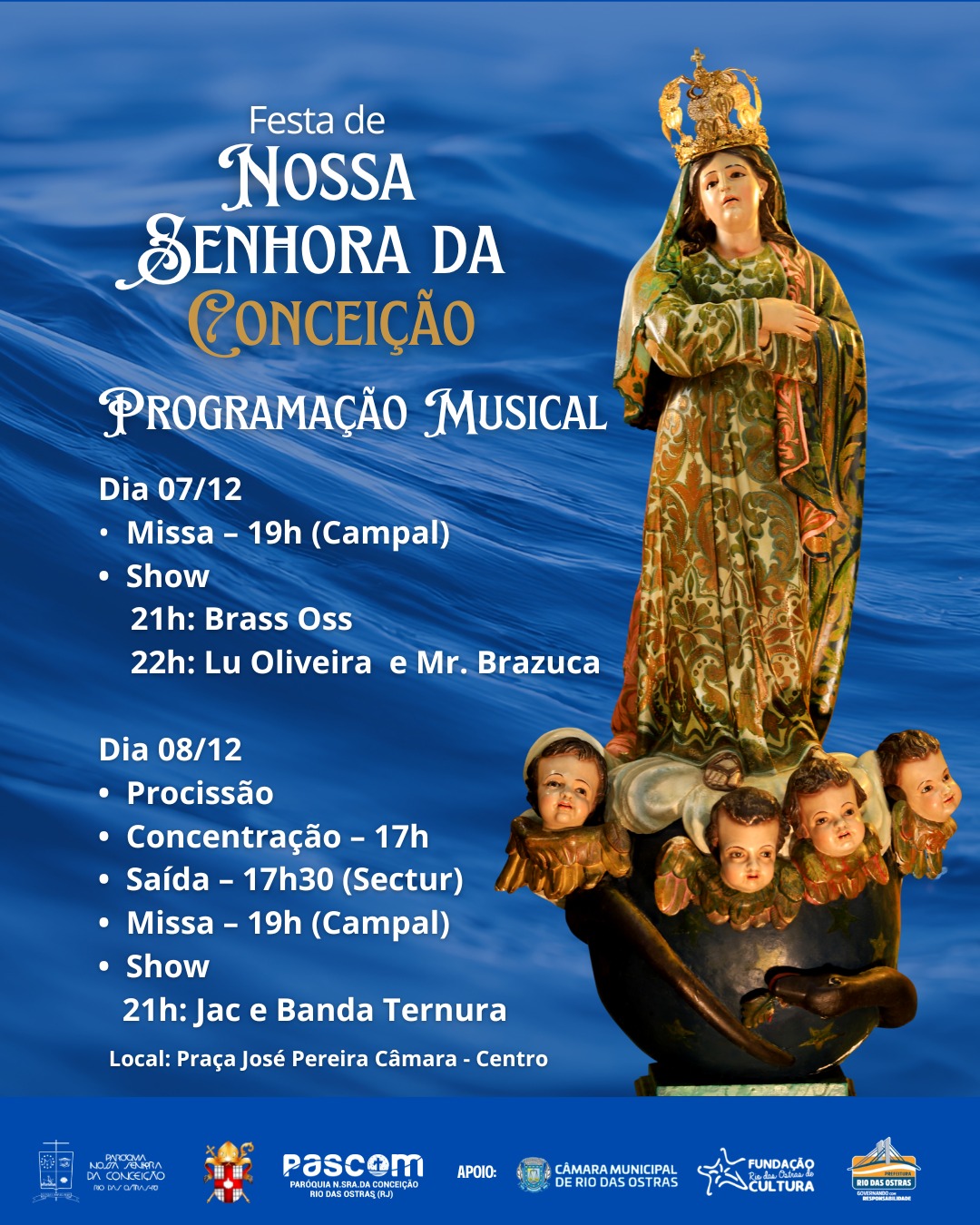 Rio das Ostras celebra a sua Padroeira, Nossa Senhora da Conceição, neste domingo, 7, e segunda-feira, 8, com procissão, missa campal e shows musicais. As atividades se concentram na Praça José Pereira Câmara, no Centro, que fica em frente à Igreja Matriz.