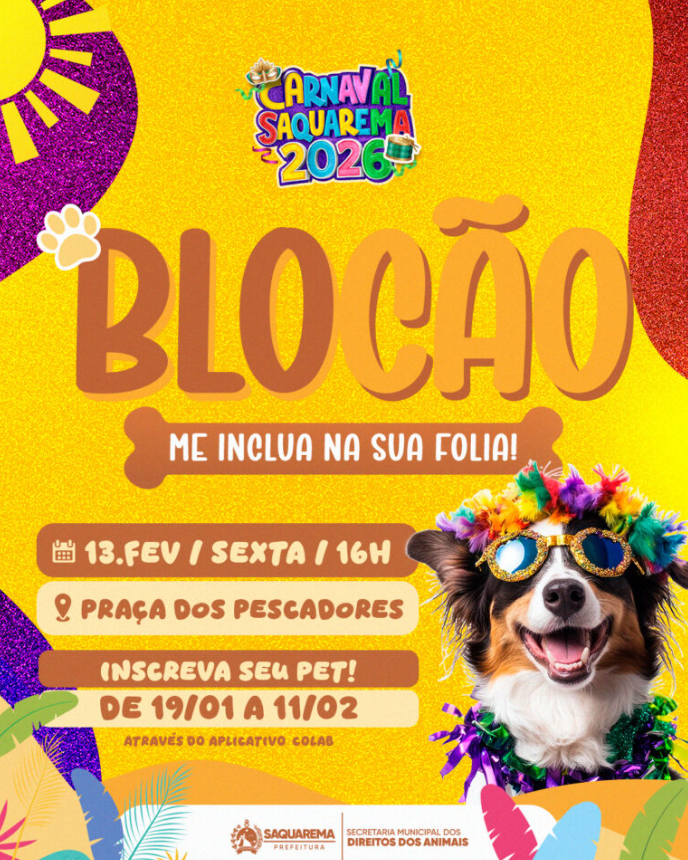 Com o objetivo de combater o aumento nos índices de abandono de animais durante o período festivo, a Prefeitura de Saquarema realizará, no dia 13 de fevereiro (sexta-feira), o Blocão de Carnaval “Me Inclua na Sua Folia”. A concentração terá início às 16h, na Praça dos Pescadores, no Centro.